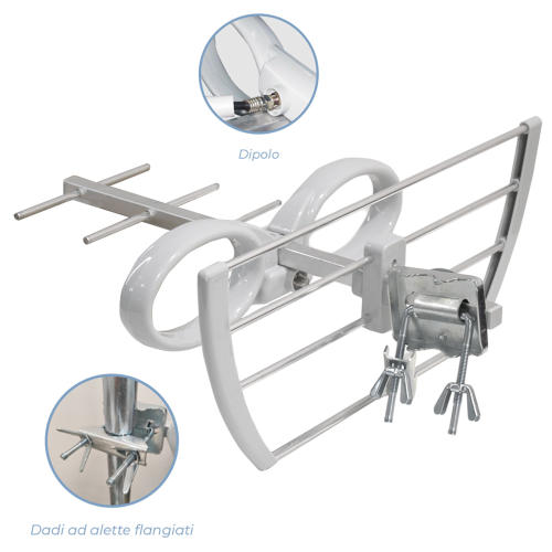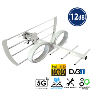 Antenna Digitale terrestre MINI DVBT2 da esterno ad alto guadagno con struttura in alluminio tubolare ed elementi plastici in ABS di colore bianco
