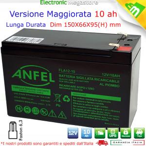 Batteria al piombo AGM Professionale a lunga durata ANFEL UL9-12 12V DC 10Ah, dimensioni 151x65x93.5mm, peso 2.45kg, potenza di spunto 127.5AH. Certificata CE, ISO9001, NCP, VdS, PT, RU. Dotata di celle di alta qualità, batteria con terminali F2. Utilissima può essere utilizzata per alimentare qualsiasi apparecchio che necessita di alimentazione a 12V con assorbimento variabile da pochi milliampere ad 9.0A ampere, minore sarà l'assorbimento più lunga sarà la durata della batteria prima di essere ricaricata, l'alta capacità della batteria permette un utilizzo degli apparecchi collegati per un lungo periodo (in relazione all'assorbimento).