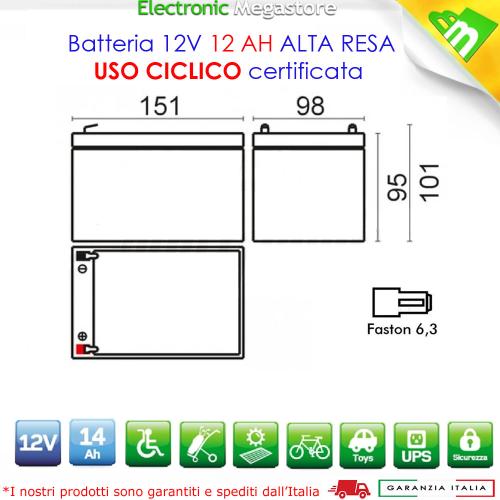 BATTERIA ERMETICA AL PIOMBO 12V 12AH EV ELECTRIC VEHICLE per veicoli elettrici ANFEL 150x98x95(h)mm realizzata con piombo di prima scelta ad altissima purezza PER USO CICLICO GRAVOSO SPECIFICI PER TRAZIONE ELETTRICA.