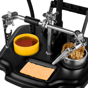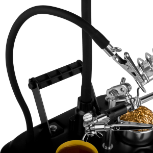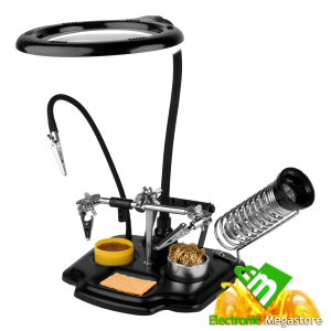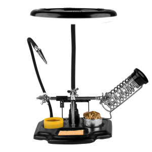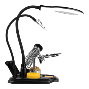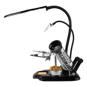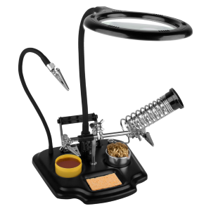 Questo prodotto è progettato per lavori di precisione, come la saldatura di circuiti stampati, l'assemblaggio di piccoli componenti, la riparazione di componenti elettronici, l'artigianato e altro ancora. Il prodotto è dotato di una lampada a LED con lente d'ingrandimento, 3 mani ausiliarie con morsetti a coccodrillo, un supporto per saldatore e un supporto per bobina di filo per saldatura. La lampada a LED è alimentata tramite la porta USB-C.